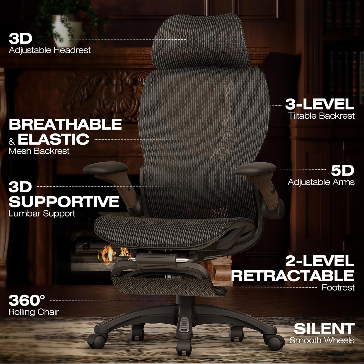 - 【Your All-Day Comfort Solution】 Premium Ergonomic Desk Chair with Footrest featuring dynamic 3D lumbar support, 5D Flip-Up Armrests, and extra-wide 3D breathable headrest, 2-position angle foot-rest, perfect for home office chairs seeking ultimate comfort