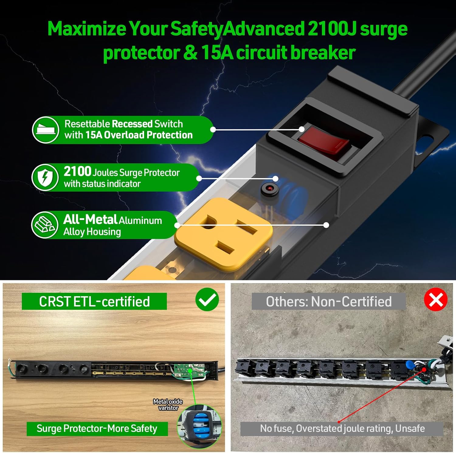 - [All-round Protection] Arm your electronics with robust 2100-Joule surge suppression. The integrated resettable 15A thermal breaker with visual alert provides failsafe overload protection, making it the defense standard for mission-critical environments: workshops, offices, home theaters, and garage labs.