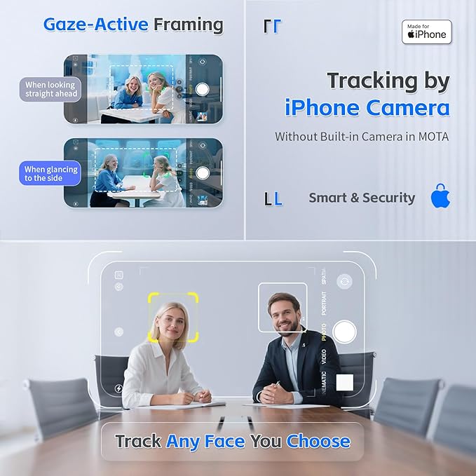 - [iPhone Tracking Beats AI Sensor and Gimbal Apps] Compared to AI tracking modules, iPhone facial tracking provides superior privacy protection by processing all data locally on your device. Unlike gimbal apps that require complex Bluetooth pairing, our iphone holder delivers stable, smooth tracking performance even in low-bandwidth environments.