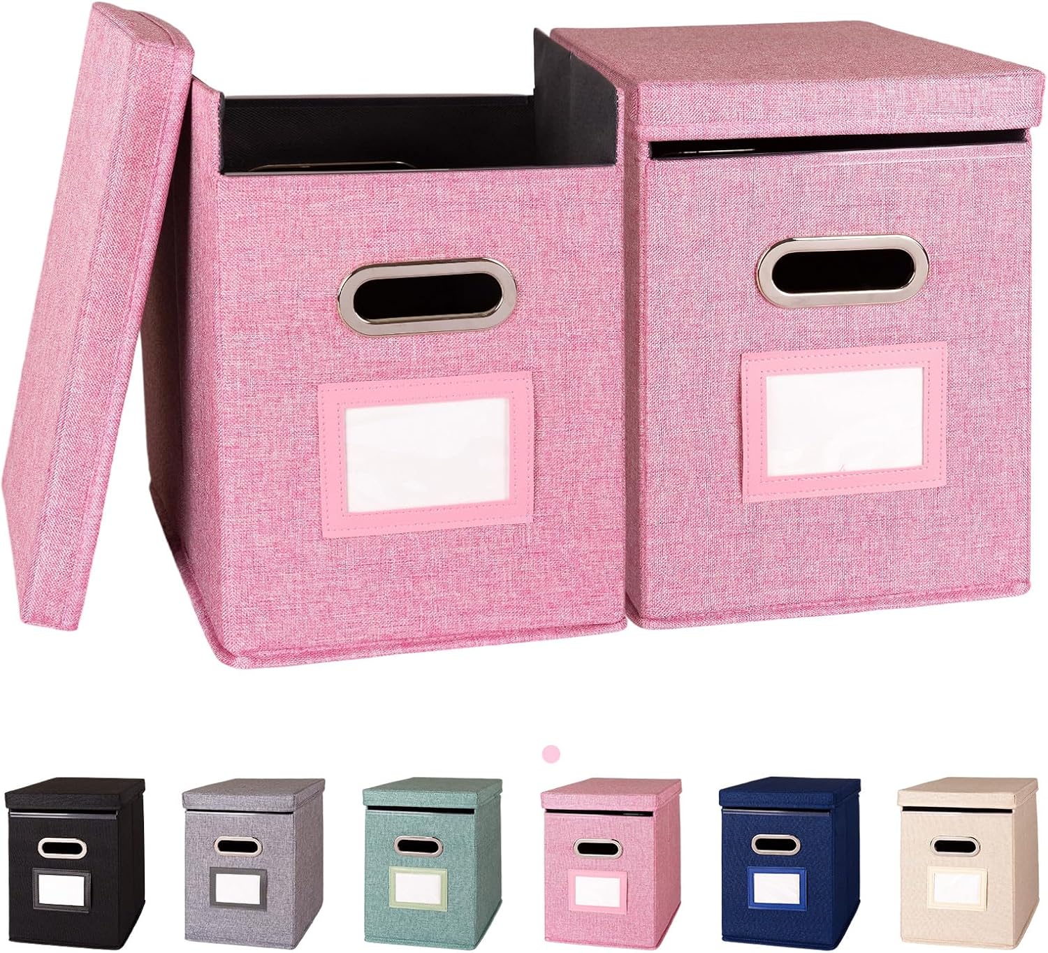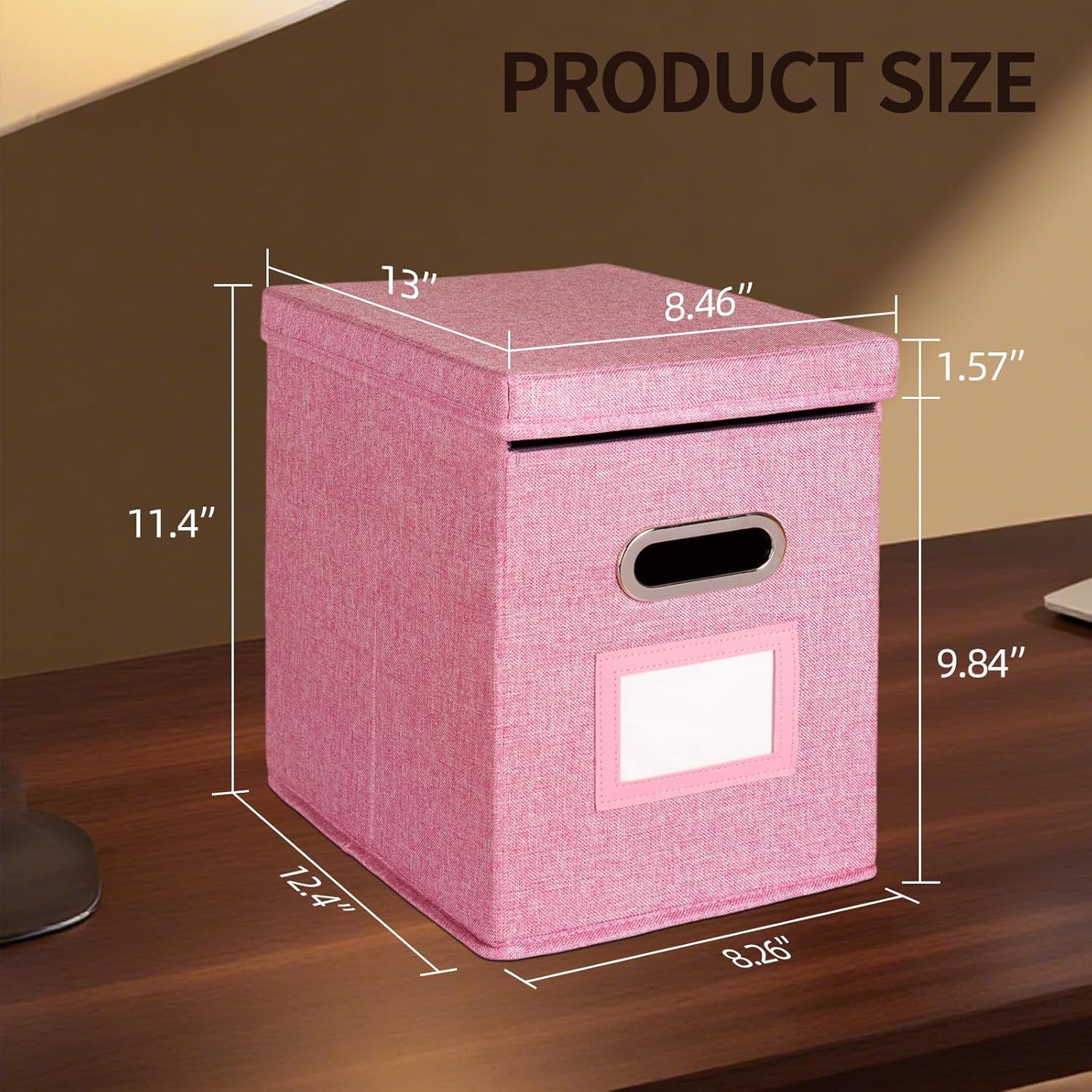 2 Pack Hanging File Folders Organizer with Lid, Letter Size Fabric File Storage Box Collapsible, Portable Office Document Holder with Metal Handle, Smooth PVC Rails, Pink