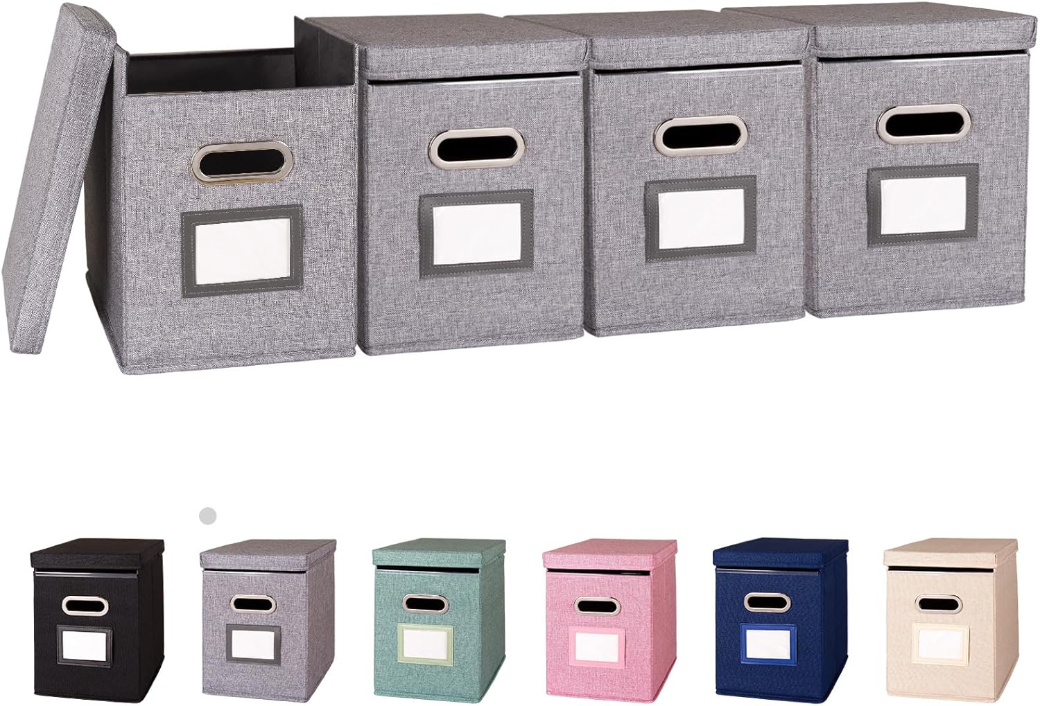 4 Pack Hanging File Folders Organizer with Lid, Letter Size Fabric File Storage Box Collapsible, Portable Office Document Holder with Metal Handle, Smooth PVC Rails, Gray