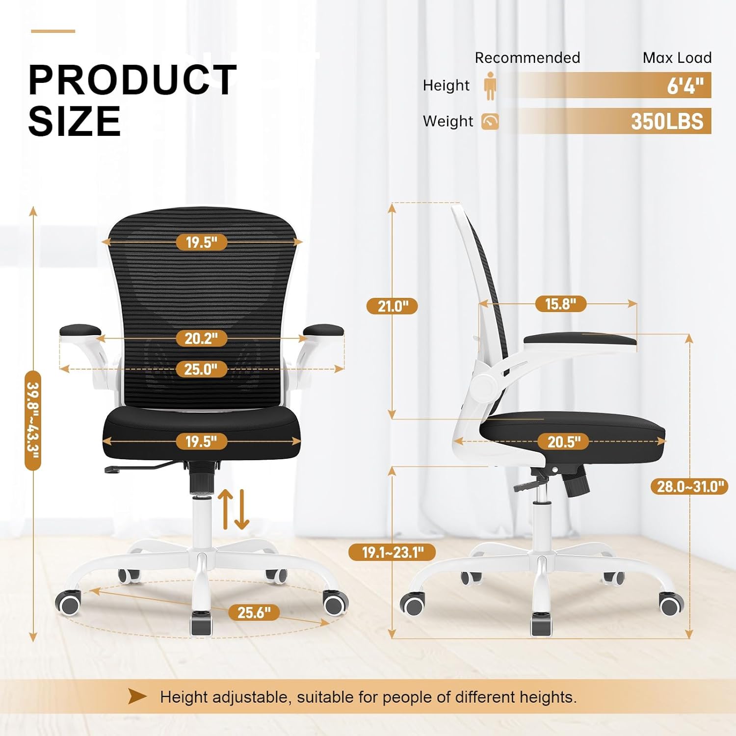- SPACE-SAVING DESIGN WITH FLIP-UP ARMS: Easily tuck the chair under your desk with 90° flip-up armrests—ideal for small spaces. The padded arms are made of high-density foam wrapped in breathable mesh, offering a soft, supportive feel for all-day use.