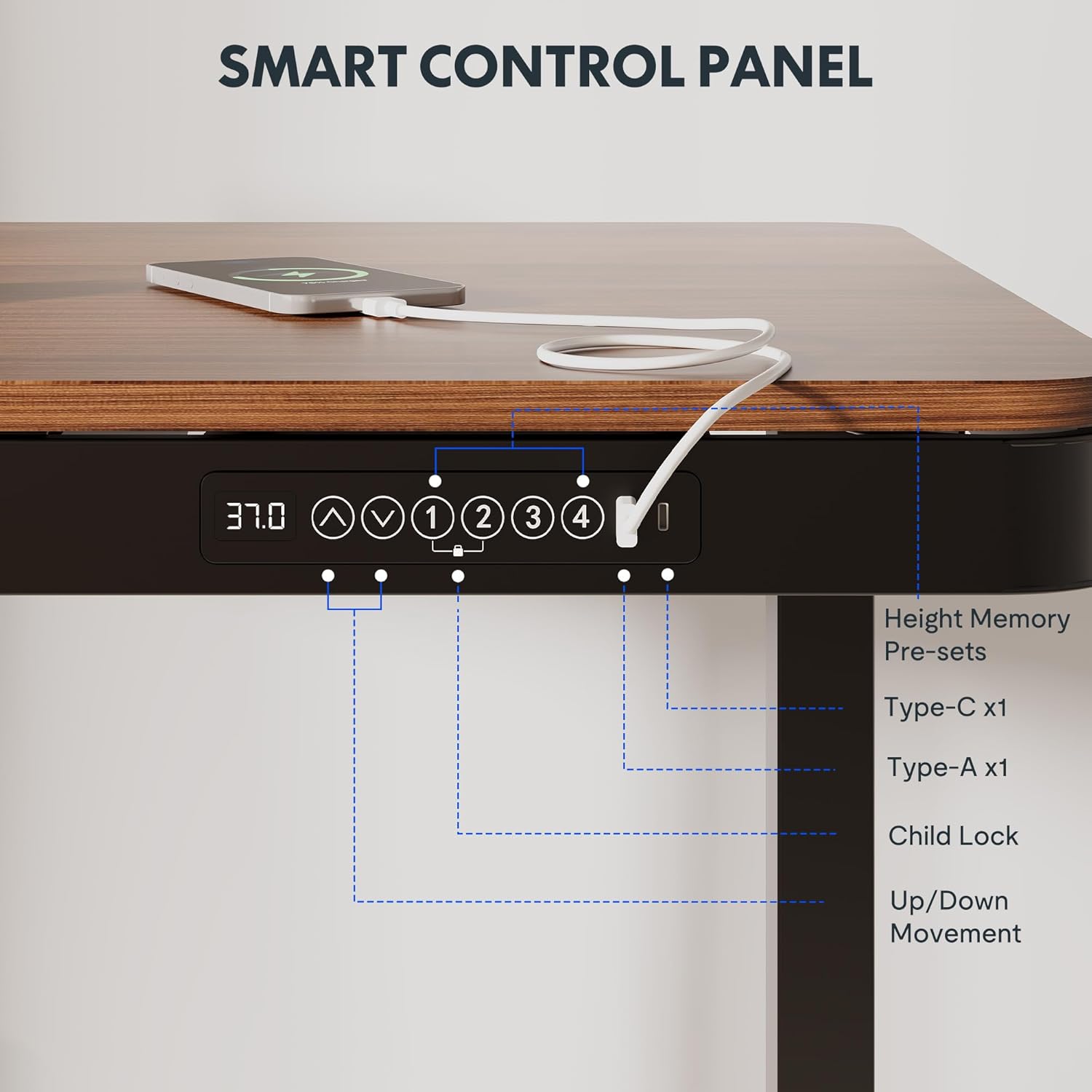 - Embedded Multiple Functions: Easily save multiple with four programmable height presets. Charge up to two devices with integrated USB ports (Type-C output: 45W fast charging, suitable for laptop charging); Type-A output: maximum of 27W fast charging; When used simultaneously with two ports, the output power is 5V 1.5A per port, 7.5W) without mess & hassle. (Note: USB ports may pause charging while adjusting desk height.)