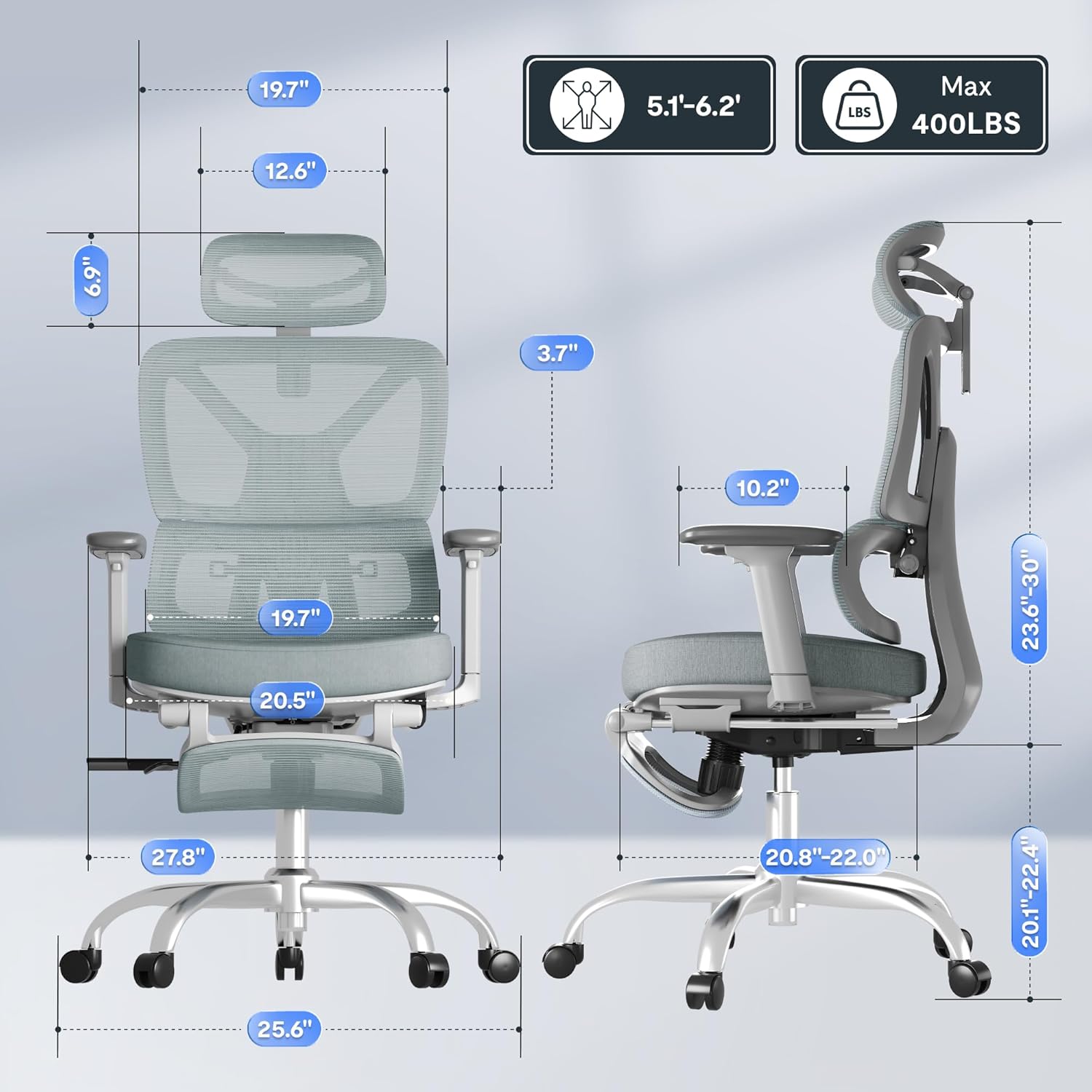 - Customizable Comfort: Featuring adjustable seat depth (17"-20"), height (20.1"-22.4"), and tilt functions to ensure a perfect fit for users between 5'1" and 6'2".